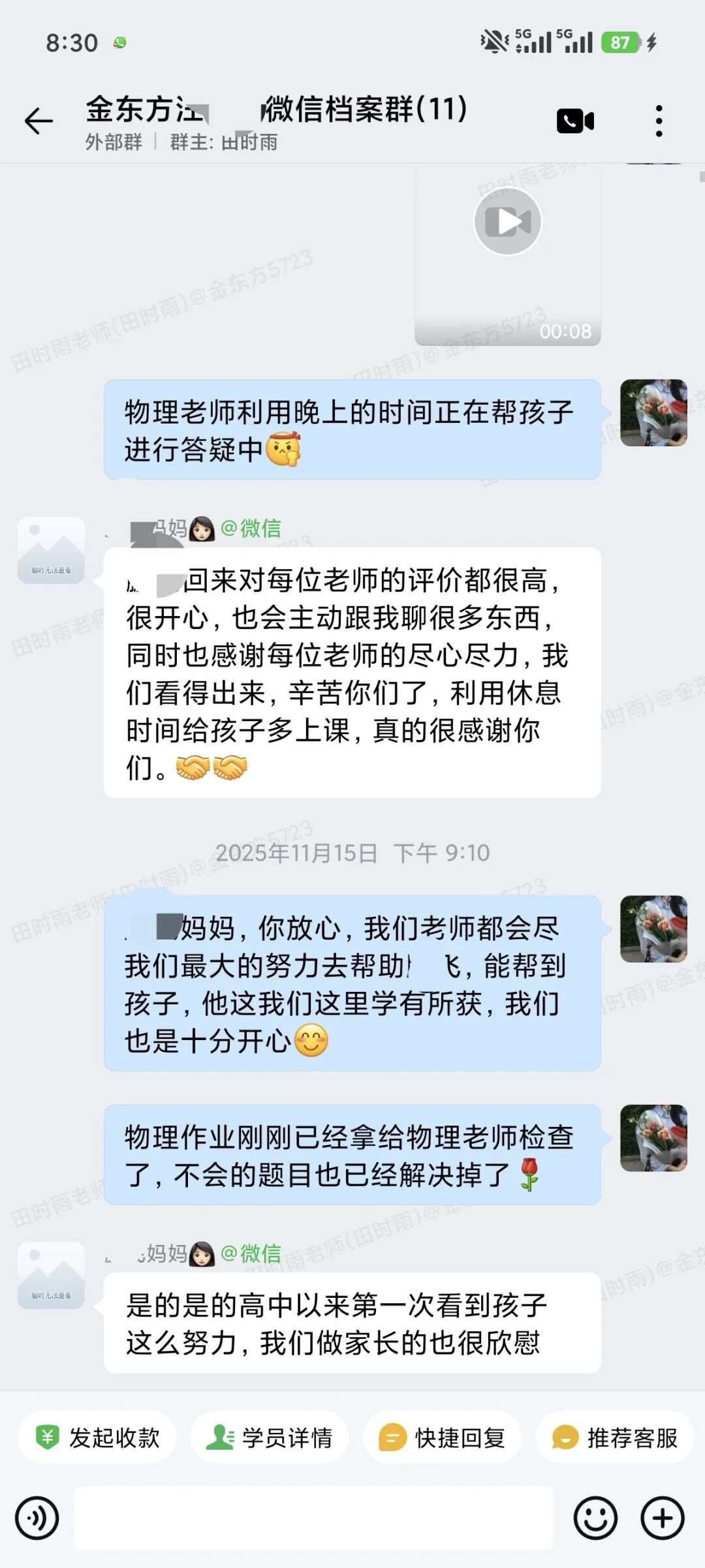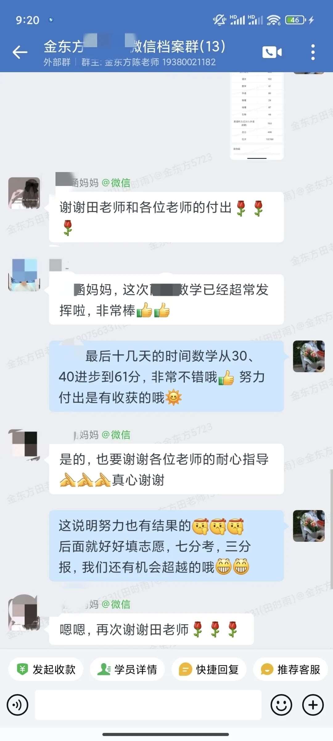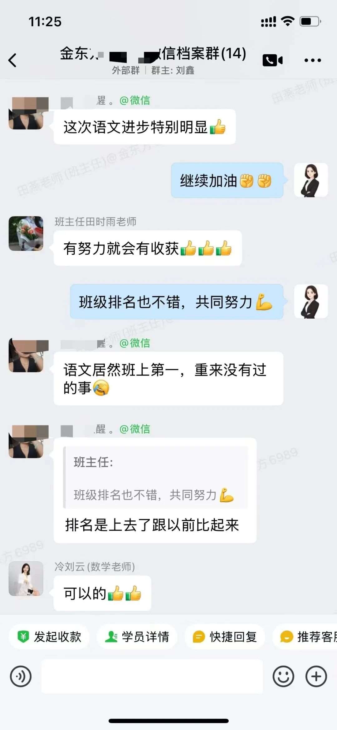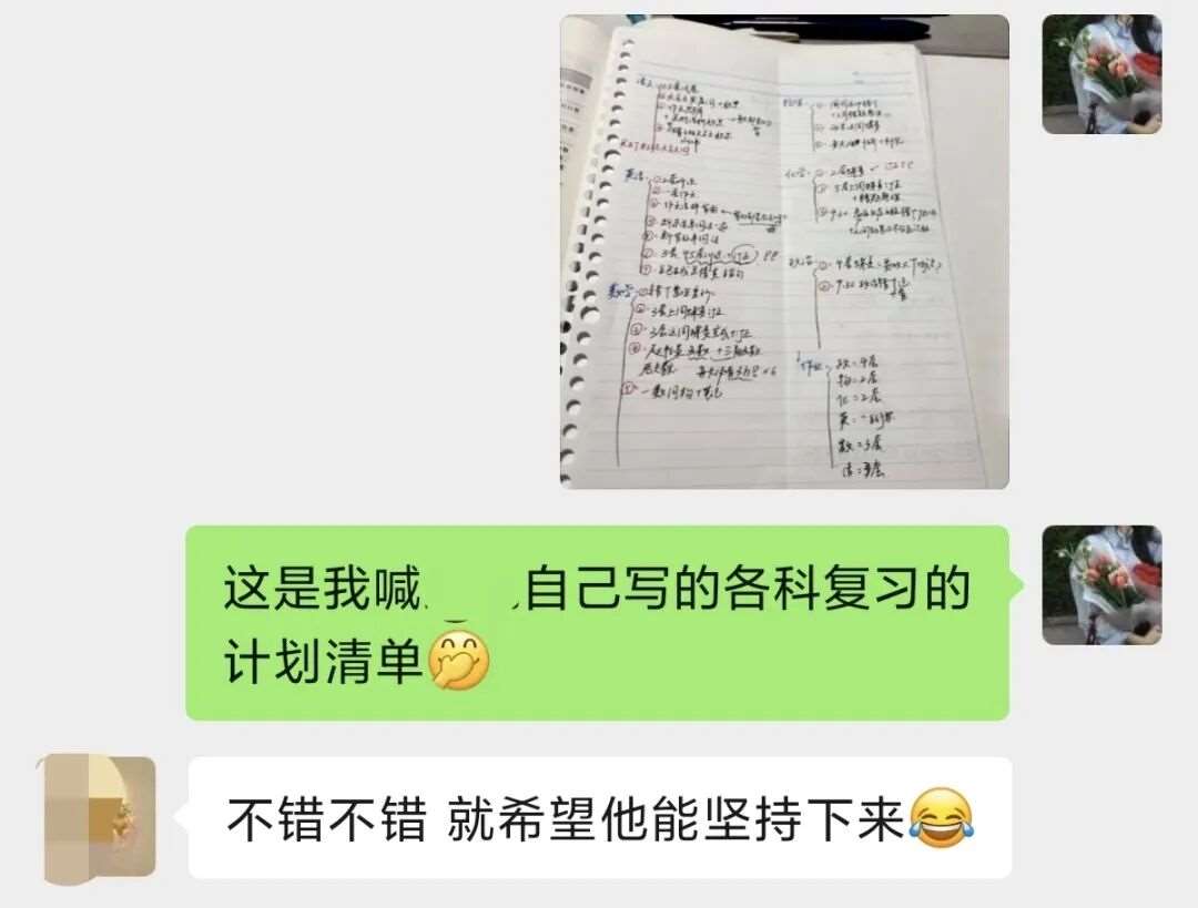 每晚不管多晚,我都会跟进他的作业情况,遇到家长发来的疑问,哪怕深夜十点也及时回复。还特意建了个小群,把“今天公式默写正确率”“主动找数学老师问了两道题”这类点滴进步同步给家长。家长从最初的焦虑试探,慢慢变成了积极配合,每天也会在群里分享孩子的学习状态。
