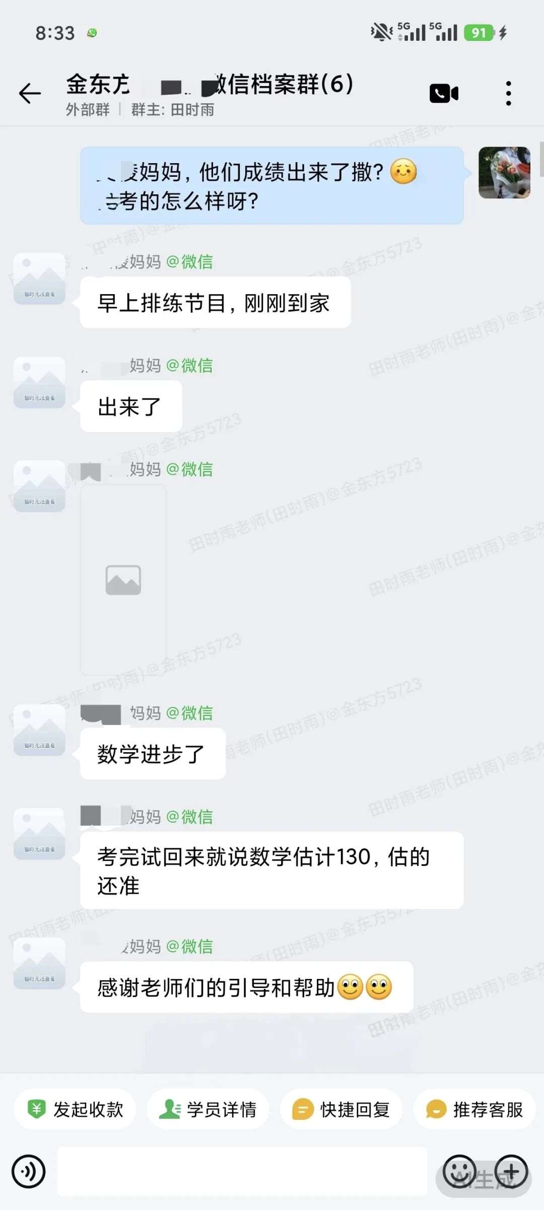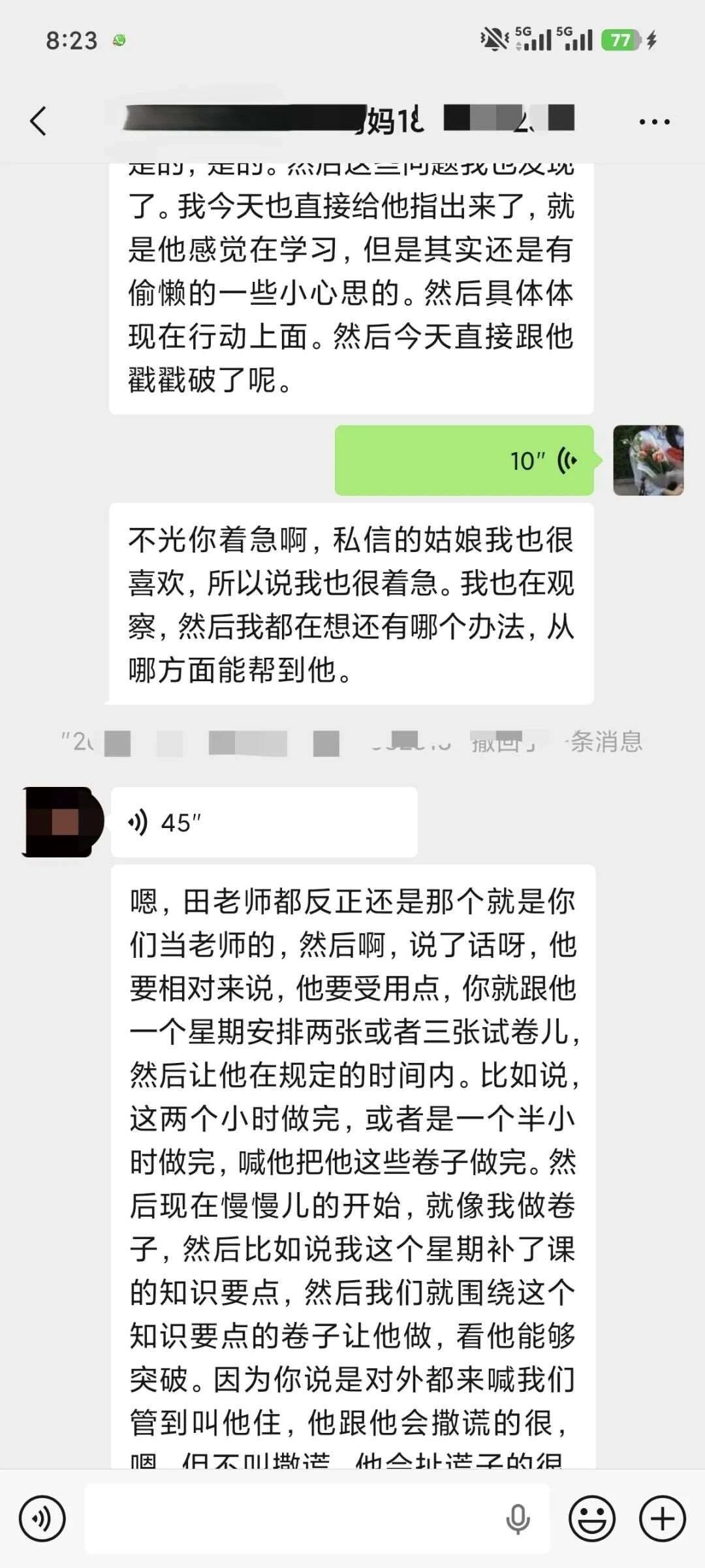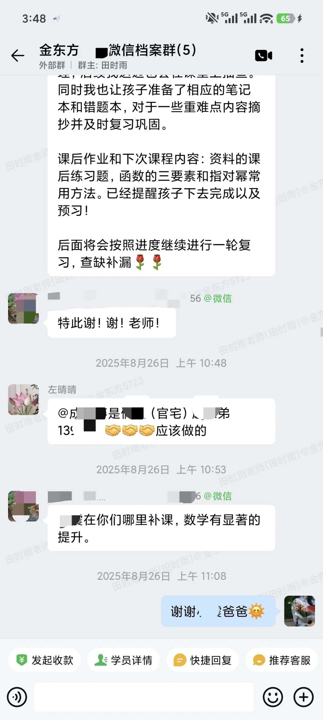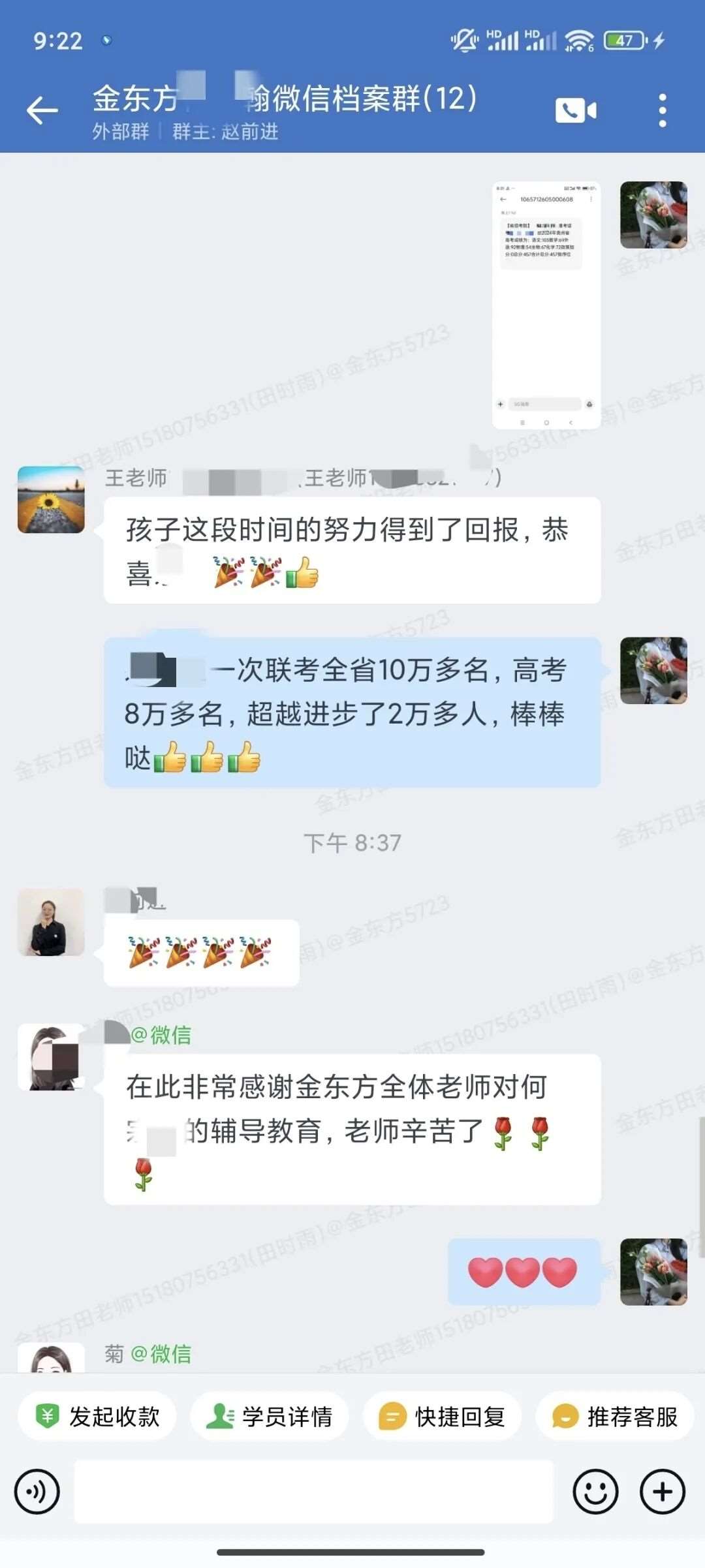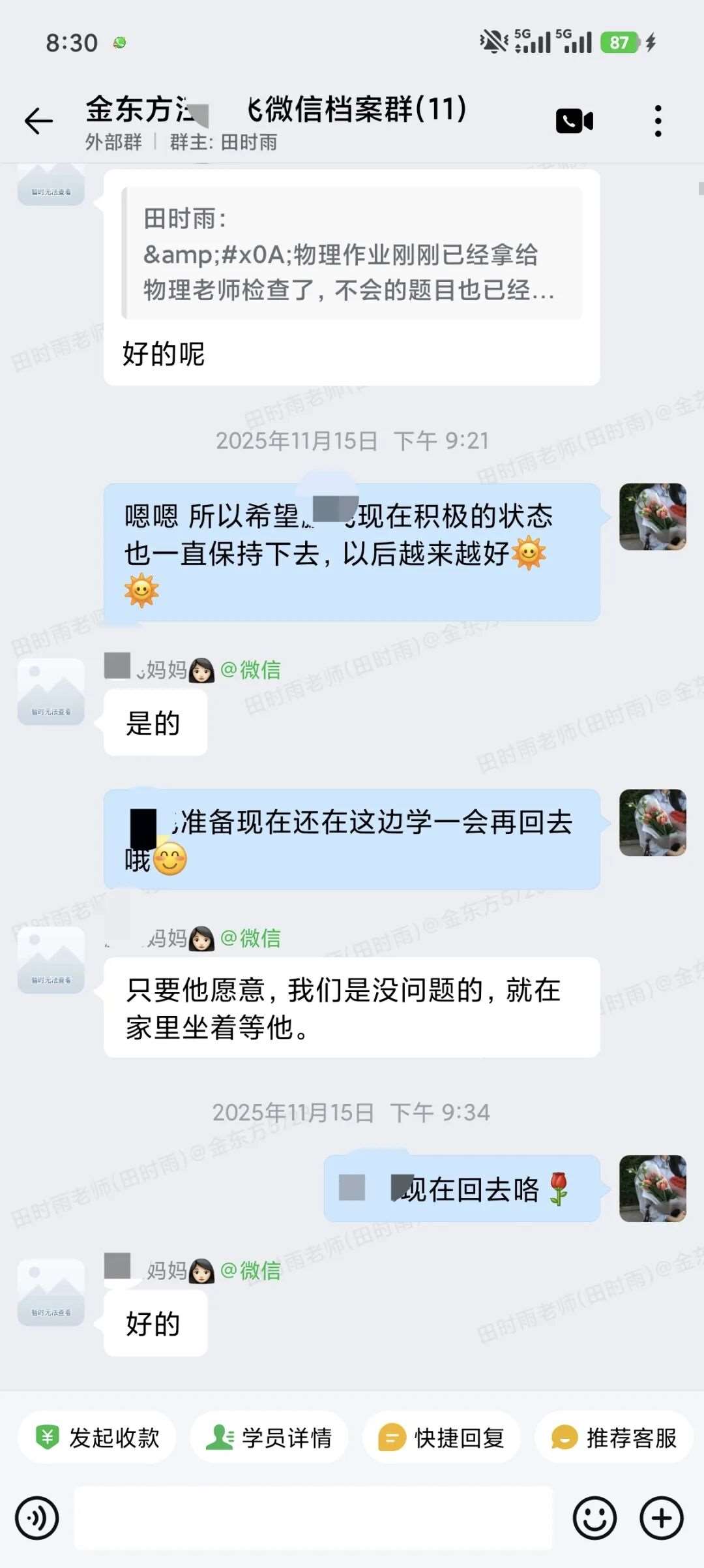 每晚不管多晚,我都会跟进他的作业情况,遇到家长发来的疑问,哪怕深夜十点也及时回复。还特意建了个小群,把“今天公式默写正确率”“主动找数学老师问了两道题”这类点滴进步同步给家长。家长从最初的焦虑试探,慢慢变成了积极配合,每天也会在群里分享孩子的学习状态。