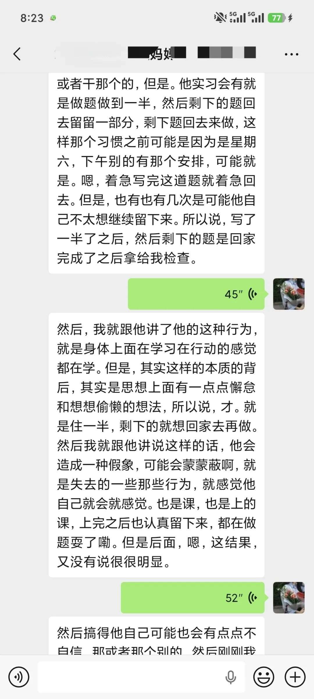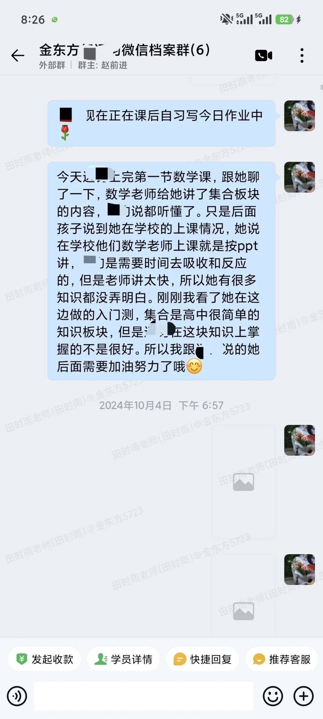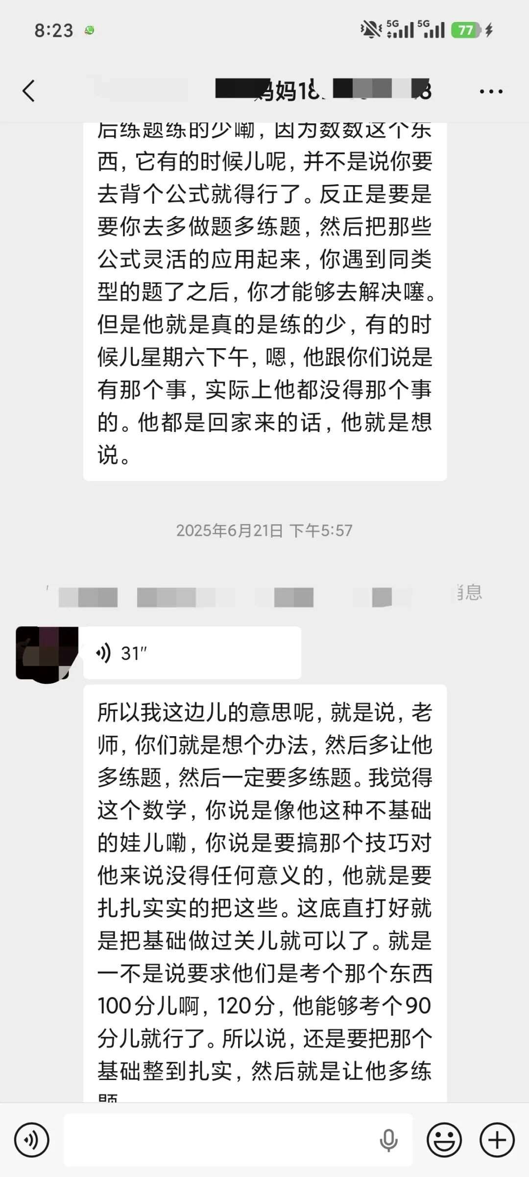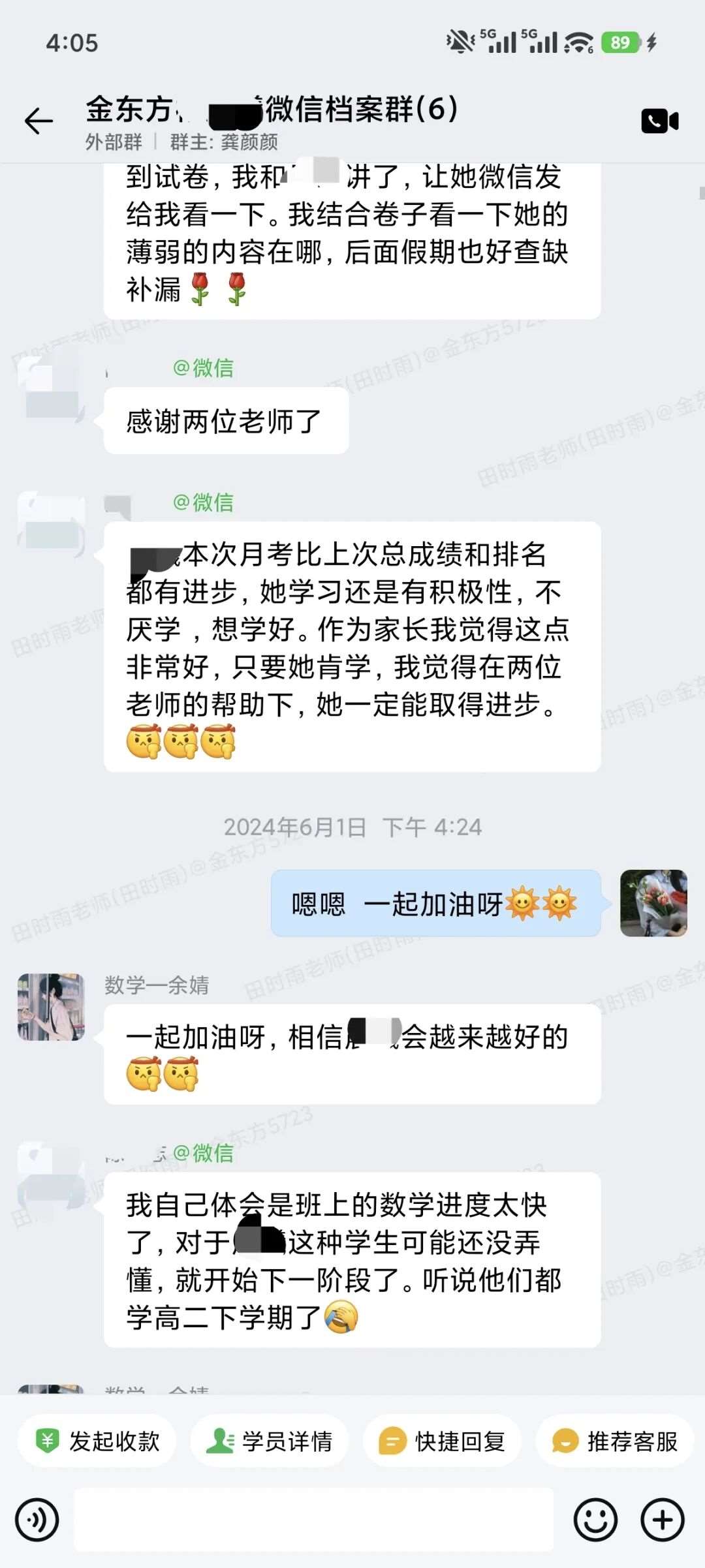 每晚不管多晚,我都会跟进他的作业情况,遇到家长发来的疑问,哪怕深夜十点也及时回复。还特意建了个小群,把“今天公式默写正确率”“主动找数学老师问了两道题”这类点滴进步同步给家长。家长从最初的焦虑试探,慢慢变成了积极配合,每天也会在群里分享孩子的学习状态。
